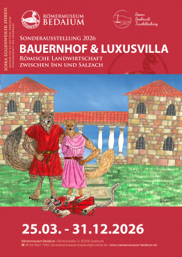 In diesem Jahr dreht sich im Römermuseum alles um die Landwirtschaft rund um die römische Kleinstadt BEDAIUM. Gemeinsam mit dem Kreisheimatpfleger Dr. Christian Soika konnte eine umfassende Karte mit den römischen Gutshöfen und Siedlungen zwischen Rosenheim und Salzburg sowie Mühldorf und den Alpen erstellt werden. Der Blick geht zu den luxuriösen und repräsentativen Villen der Oberschicht, wie auch zu den kleinen Gutshöfen von ehemaligen Veteranen der römischen Armee. Das spannende Thema wird anhand von eigens erstellten Rekonstruktionen und informativen, kurzen Texten für Jung und Alt interessant aufbereitet. Hauptattraktion der Ausstellung ist natürlich das lebensgroße Diorama mit den historischen Figuren die Ausschnitte aus dem Landleben in der Provinz zeigen. Thematisch passende Mitmachstationen für Groß und Klein laden ein, selbst aktiv zu werden. Die Sonderausstellung 2026 findet in Zusammenarbeit mit den Leihgebern Römermuseum Grabenstätt und Heimat- und Geschichtsverein Tacherting statt. Ein Besuch der Sonderausstellung des Römermuseums BEDAIUM lohnt als regionale Ergänzung zur großen Ausstellung im Lokschuppen Rosenheim „Römer - Gesichter eines Weltreichs“. Ein reichhaltiges Veranstaltungsprogramm mit Museumsführungen, Workshops, Abenteuernachmittagen und Familientagen mit der Hauslegion des Museums, der LEGIO IX HISPANA rundet das Jahresprogramm ab. Es gibt viel zu entdecken im Römermuseum Seebruck. VIVAT BEDAIUM!