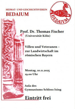 Am 10. November 2025 um 19 Uhr lädt der Heimat- und Geschichtsverein Bedaium in Seebruck e.V. gemeinsam mit dem Gymnasium Schloss Ising zu einem Vortrag in den Veranstaltungssaal des Gymnasiums nach Ising ein. Referent des Abends ist Prof. Dr. Thomas Fischer, renommierter römischer Provinzialarchäologe.