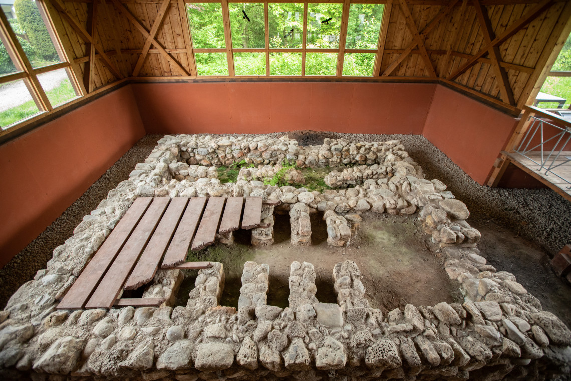 Überdachte Ausgrabung einer römischen Fußbodenheizung